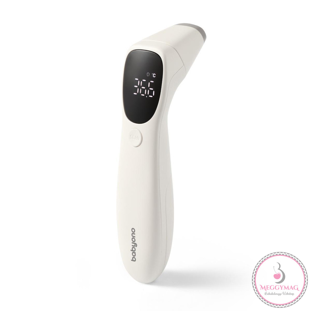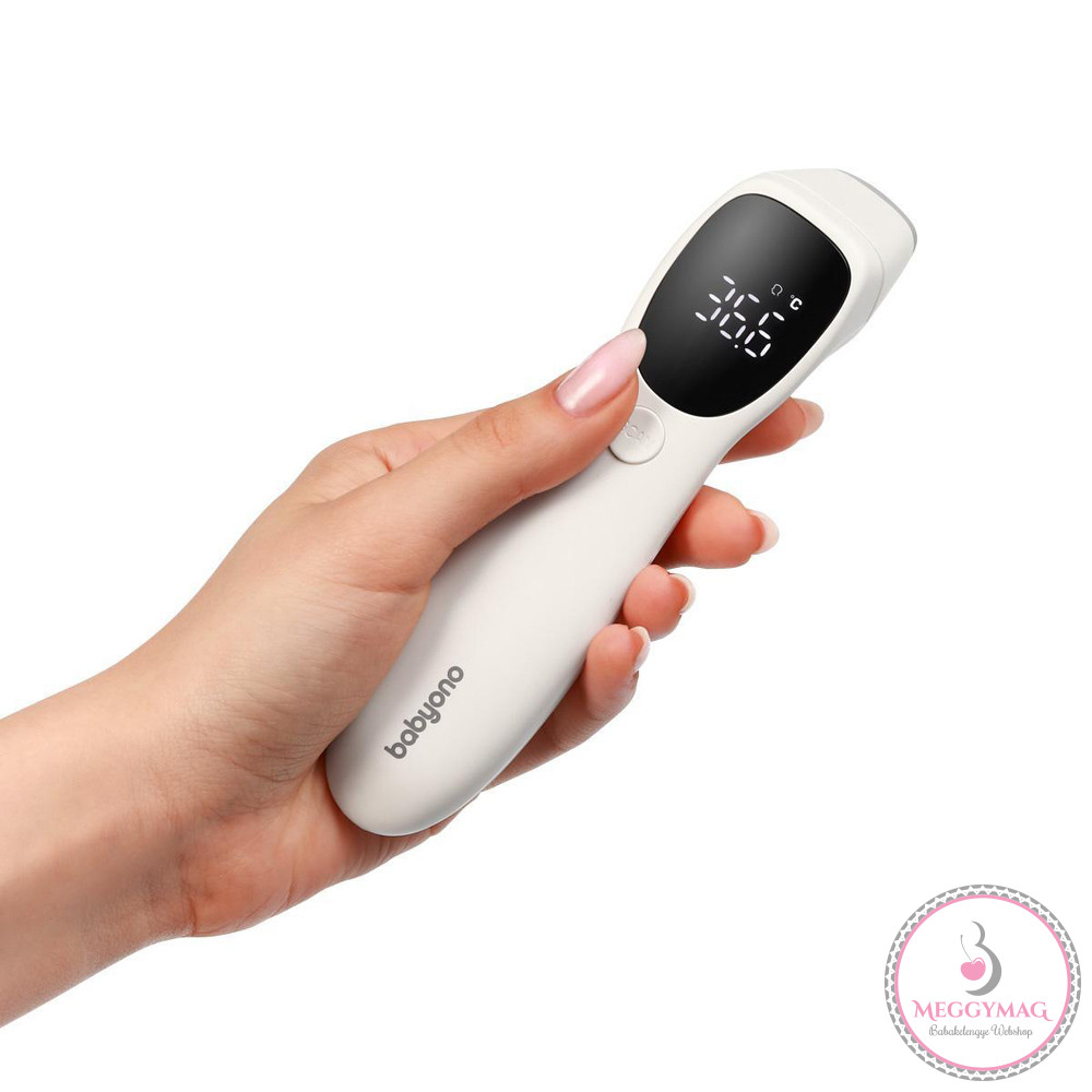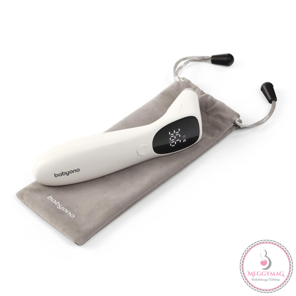 Érintésmentes infravörös hőmérőA Babyono érintésmentes hőmérővel gyorsan és pontosan mérheti a hőmérsékletet a homlokból vagy a fülből. Mindössze annyit kell tennie, hogy megnyomja a gombot, hogy egy másodperc alatt pontos eredményt kapjon.Ez sokkal kényelmesebb, mint a hagyományos modellek.A csendes rezgő riasztó és a LED fény lehetővé teszi a hőmérséklet mérését akkor is, amikor a baba alszik.A stílusos megvilágított LED-képernyőnek köszönhetően még éjszaka is könnyedén leolvashatja az eredményeket.GYORS HŐMÉRSÉKLET ELLENŐRZÉS:Hőmérőnkkel gyorsan lemérheti a hőmérsékletet a homlokon és fülben. Nyomja meg egyszer a gombot és az eredményt láthatja mindössze 1 másodperc alatt.Megbízható, kényelmes és felhasználóbarát.LED KÉPERNYŐ TULAJDONSÁGAI:A hőmérő LED kijelzős. A kijelző világos és könnyen olvasható. Lehetővé teszi az eredmények könnyű leolvasását, még éjszaka is.EGYSZERŰ ELLENŐRZÉS:A rezgő riasztónak és a beépített LED lámpának köszönhetően éjszaka is mérheti a hőmérsékletet. A készülék diszkrét és nem zavarja az alvó babát.JELLEMZŐK:- MÉRÉSTÖRTÉNET:A hőmérő képes megjegyezni az utolsó 32 eredményt. Így könnyen nyomon követheti a hőmérséklet-ingadozásokat időben.- EGYSZERŰ HASZNÁLAT:A hőmérő az egyetlen gombnak köszönhetően felhasználóbarát.- KÉTFÉLE HŐMÉRSÉKLET ELLENŐRZÉS:A hőmérő Celciusban vagy Fahrenheitben is mutathat eredményeket.KÉSZLETBENA hőmérő praktikus tárolótáskával és elemekkel van felszerelve.MŰSZAKI TULAJDONSÁGOK• A homlokból és a fülből mért hőmérséklet• Megvilágítás• Rezgő riasztás 38°C feletti hőmérséklet esetén• A hőmérsékleti eredmények Celsiusban és Fahrenheitben jelennek meg• Memória az utolsó 32 eredményhez• LED képernyő• A készlet tartalma: hőmérő tárolótáska, elemek, használati útmutató- Fontos! A termék egészségvédelmi és higiéniai terméknek minősül. Amennyiben a csomagolás felbontásra került, vagy a kipróbálás jelei látszódnak a terméken, úgy a 14 napos elállási jog érvényét veszíti a 45/2014. (II. 26.) korm. rendelet 29. § (1) bekezdése alapján.