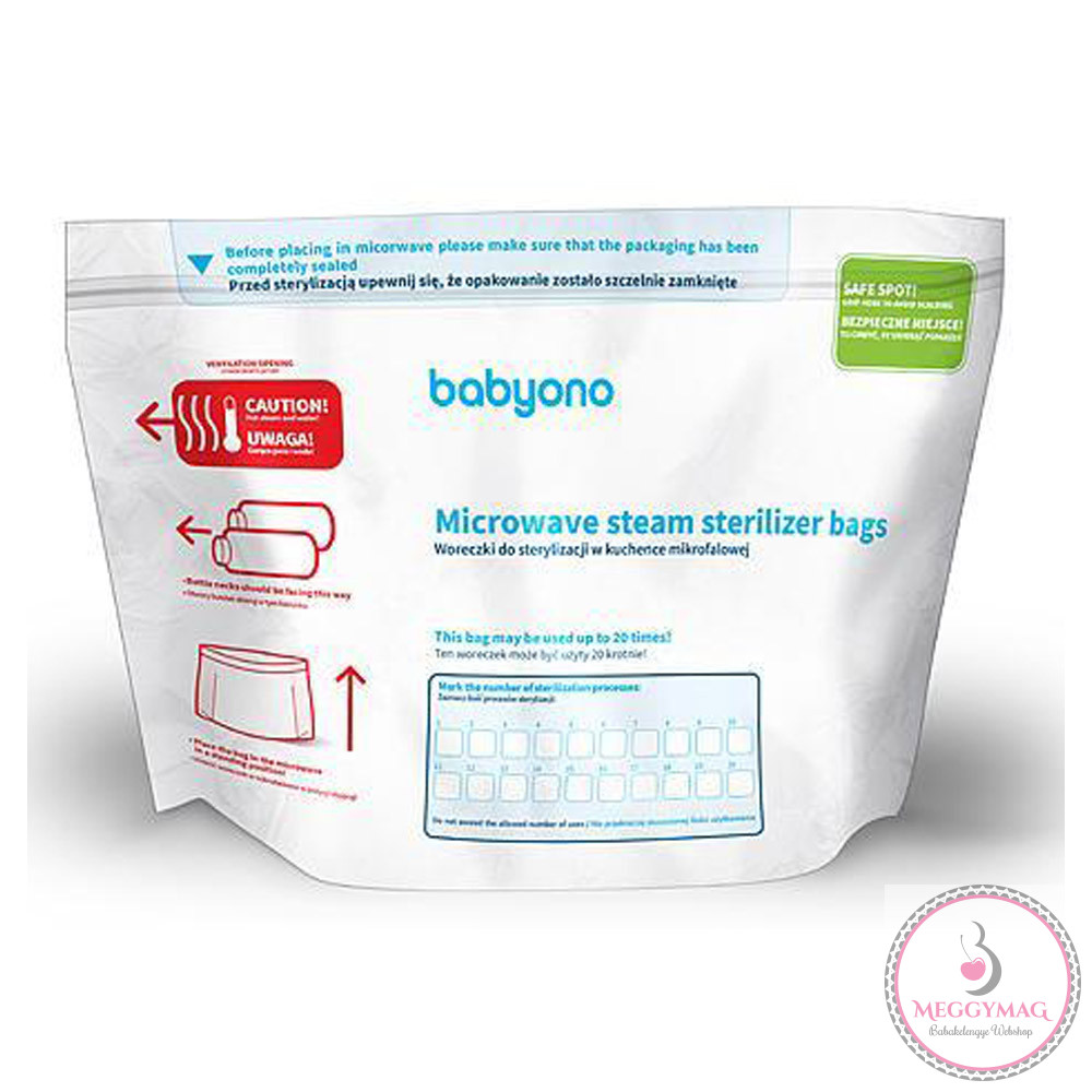 Egyszerű, biztonságos, és gyors sterilizálás. Minden tasak 20 alkalommal használható.5 db / csomagA mikrohullámú készülékben használható sterilizáló zacskók egyszerű, gyors és biztonságos módja a csecsemők és gyermekek számára készült cumisüvegek, mellbimbóvédők, cumik, mellszívó alkatrészek és egyéb termékek sterilizálásának. Ez egy olyan termék, amely felváltja a hagyományos sterilizálót. A sterilizálás mindössze 1,5 percet vesz igénybe, és három egyszerű szakaszban hajtható végre. A sterilizálási folyamat során a zsákban keletkező vízgőz a baktériumok és más kórokozók akár 99,9% -át is megszünteti. Minden tasak legfeljebb 20-szor használható. A termék tartós és biztonságos anyagokból készül, teljesen Bisphenol A -tól mentesen. A termék biztonságos, megbízható és funkcionális.A baktériumok és más kórokozók 99,9% -a eliminálható biztonságos, élelmiszeripari anyagokból készült termékkel, vegyi anyagok használata nélkül.- BPA mentes- a sterilizálás csak 1,5 percet vesz igénybe- a sterilizálás három egyszerű lépésben történik- ideális cumisüvegek és cumik, valamint mellszívó alkatrészek sterilizálásához- kis méretüknek köszönhetően könnyen tárolhatók- könnyen és praktikusan tárolható és használható, akár otthonodon kívül is