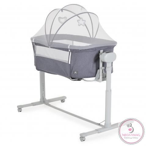 Alkalmas babáknak 0 hónapos kortól. A „szülői ágyhoz való rögzítés” funkció megkönnyíti az első hónapok éjszakáit, hogy a szülő mindig az újszülött mellett legyen. Alkalmas minden típusú ágyhoz, minimum 50 cm magassággal a padlótól és maximum 80 cm. Magassága 7 pozíció egyikébe állítható, a kiságy pedig 30°-os szögben dönthető, hogy segítse babája emésztését, javítsa a légzést és kezelje a refluxot. 4 kerék van ütközőkkel a könnyű mozgatáshoz. A szuperkényelmes matrac és a puha oldalak megfelelő helyzetben tartják babáját, és biztonságban tartják. Normál kiságyként használható. Van szúnyogháló és egy kosár a kiegészítőknek. FIGYELMEZTETÉS! A kiságy nem alkalmas olyan gyermekek számára, akik tudnak ülni, térdelni vagy felhúzni magukat. Ne használja ezt a terméket anélkül, hogy előbb elolvasta a használati utasítást. Ne használja a kiságy „Együtt alvó funkcióját”, ha a felnőtt ágya 50 cm-nél kisebb vagy 80 cm-nél magasabb a padló felett.
