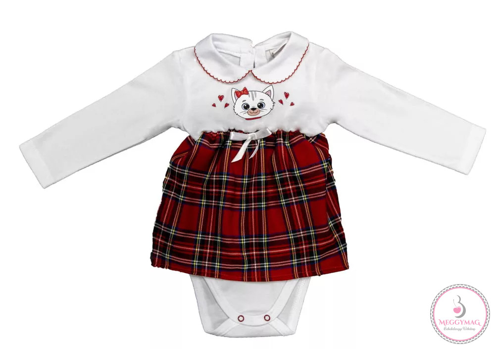Ebben a csodálatos hosszú ujjú kombidresszben a kis hercegnőd igazán stílusos lesz. A kombidressz aranyos cica mintával díszített. A galléros kialakítás és a hátul található gombok praktikussá teszik a ruhát, míg az elején található masni és a kockás anyagból rávarrt szoknya pedig igazán divatossá. A kombidressz anyaga 100% pamut, míg a kiegészítő anyaga 65% pamut és 35% poliészter, így kellemesen puha a bőrön és kiváló minőségű. Ez a ruha nem csak kényelmes, de stílusos is, és minden kislány szívesen viseli majd. A termék garantálja a minőséget és az autentikus dizájnt
