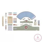 A szett mindent tartalmaz, amire egy kis állatorvosnak szüksége lehet: kihúzható zuhanyfej mosdóval, fésű, hőmérő, fecskendő, ragtapaszok, valamint egy textil fejpánt és egy csipesz a röntgenképek vagy illusztrációk rögzítésére.