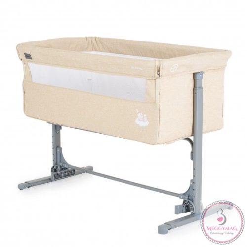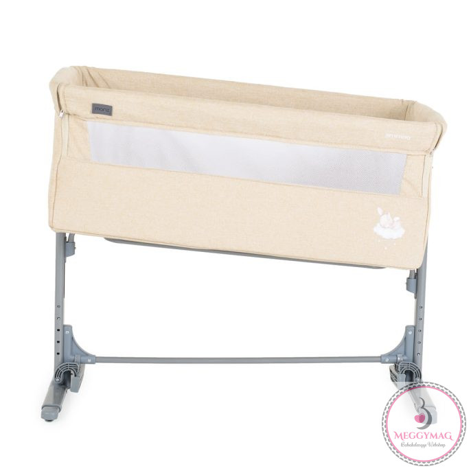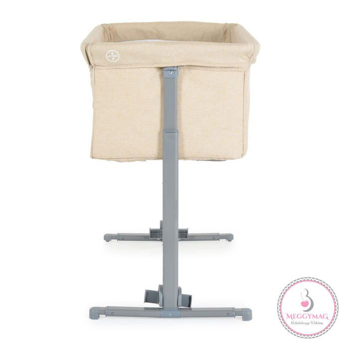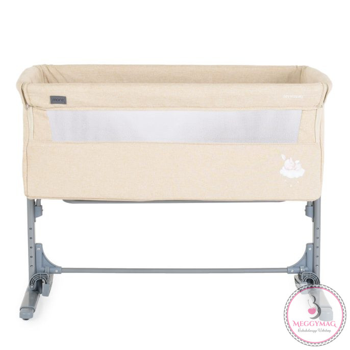 Alkalmas 0 hónapos kortól. A termék legfeljebb 9 kg-os gyermekek számára készült.A „Szülői ágyhoz rögzítés” funkció megkönnyíti a szülő számára az első hónapok éjszakáit, hogy mindig az újszülött mellett lehessen. Alkalmas minden olyan ágyhoz, amelynek magassága a padlótól számítva legalább 50 cm és legfeljebb 63 cm. A magasság 5 pozícióban állítható, és a kiságy 30°-os szögben dönthető, hogy segítse a baba emésztését, javítsa a légzést és kezelje a refluxot. Normál kiságyként is használható. Egy hintamechanizmust tartalmaz. Fém lábakkal, lehajtható oldal fallal. Tárolóháló nélkül, vászon anyagból.
