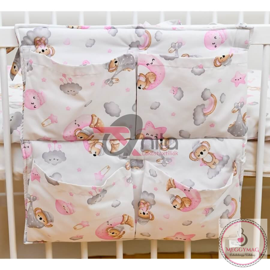 Zsebes tároló nagyon praktikus termék, amely a rávarrt kötők segítségével könnyen a kiságyra helyezhető .Zsebes tárolón két sorban helyeztünk el bővített zsebeket. Az alsó és felső sorban 2-2 bővített zseb szolgál a pelusok, játékok tárolására.